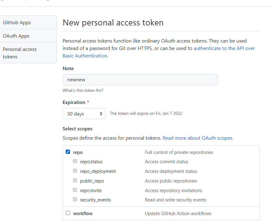 5. Note에서 개인적으로 네이밍을 한 후, 아래의 repo를 클릭한다. 그런 후에 맨 아래의 create token를 클릭하면 새로운 token이 생성되는데, 이를 복사해둔다.