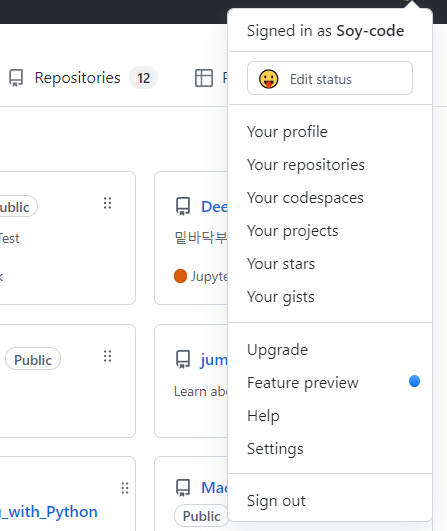 1. 본인의 깃헙 계정에 들어가서 설정 버튼에서 Settings를 눌러준다.