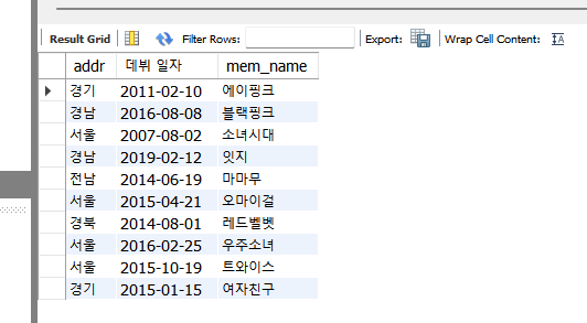 SELECT addr, debut_date "데뷔 일자", mem_name FROM member ;