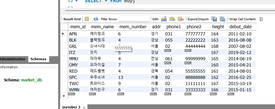 Create table 문을 통해서 member 테이블을 만듦. 멤버 테이블은 mem_id를 primary key로 하였고, buy 테이블에서는 num을 primary key로 하였다.