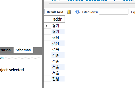 DISTINCT는 조회된 결과에서 중복된 데이터를 1개만 남기게 한다. member 테이블에서 addr만을 조회해보자.