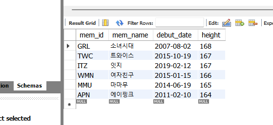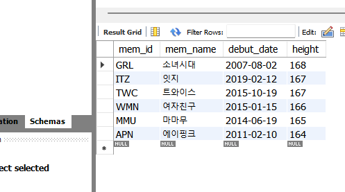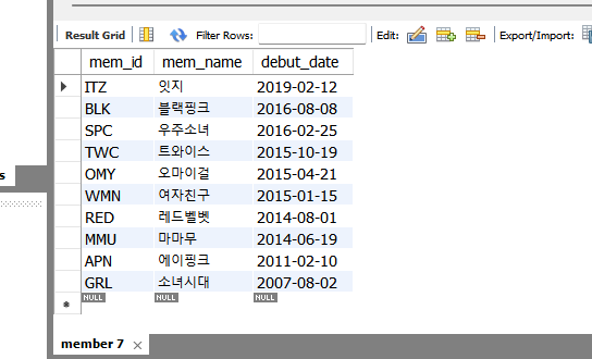 member 데이터에서 데뷔일자가 빠른 순으로 mem_id, mem_name, debut_date를 출력해보고자 한다.