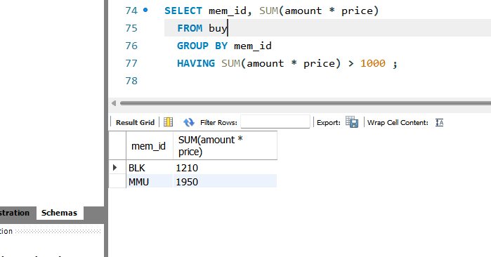 앞서 buy 테이블에서 회원(mem_id)별로 총 구매액을 구해보았다. 여기서 총 구매액이 1000이상인 회원만을 뽑고싶다고 했을 때, 보통 WHERE절을 생각할 수 있다.