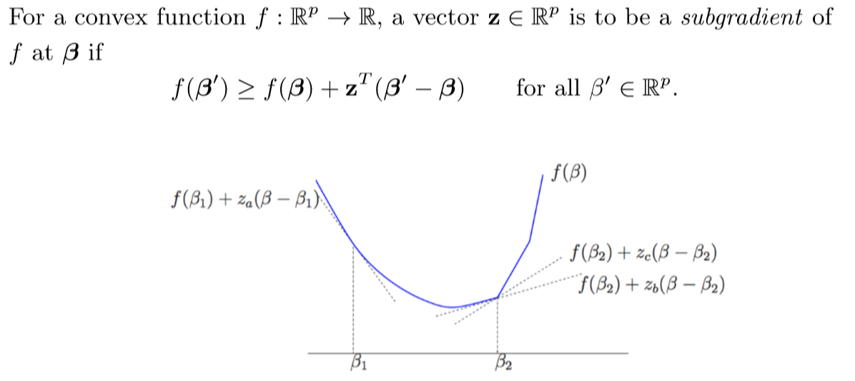 beta1에서는 f가 diffrentiable하기 때문에 그 포인트에서는 subgradient는 f'(beta1)으로 오직 하나만 존재한다. 하지만 beta2의 포인트에서는 미분이 가능하지 않기 때문에 여러 개의 subgradients가 존재한다. Beta라는 포인트에서의 모든 subgradients들의 집합을 subdifferential이라고 부르고 $\partial f(\beta)$ 라고 쓴다. zero-gradient는 이에 포함된다.