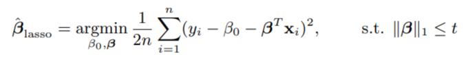 Ridge 모형에서는 Constraint가 L2-norm으로 주어진다. 이제 Lasso에서는 제약 조건이 L1-norm으로 주어진다. Lasso 추정량은 다음과 같은 식을 만족하는 베타 값이다.