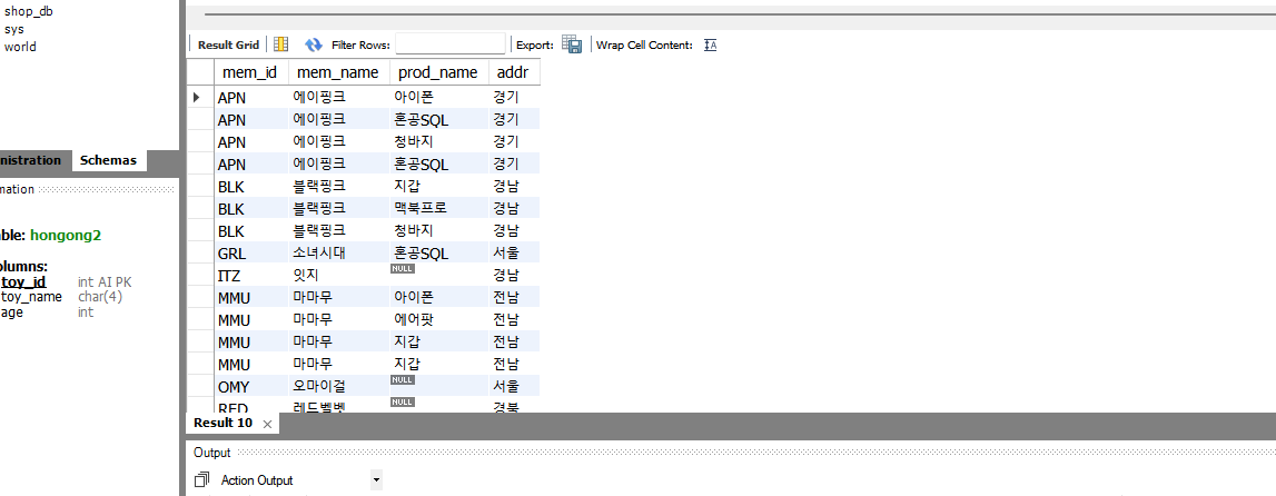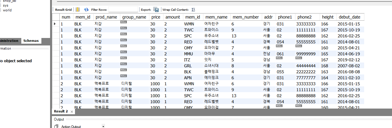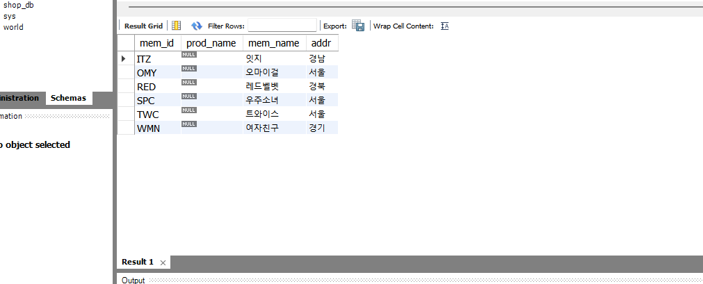 ITZ의 경우는 회원의 정보는 있는데 구매이력이 없어서 prod_name에 NULL값이 들어간 것을 볼 수 있다.