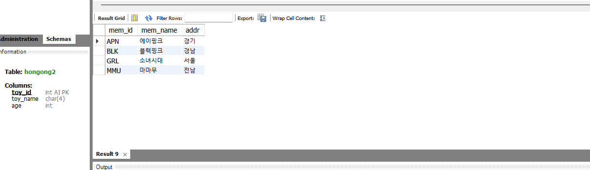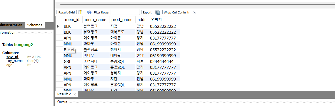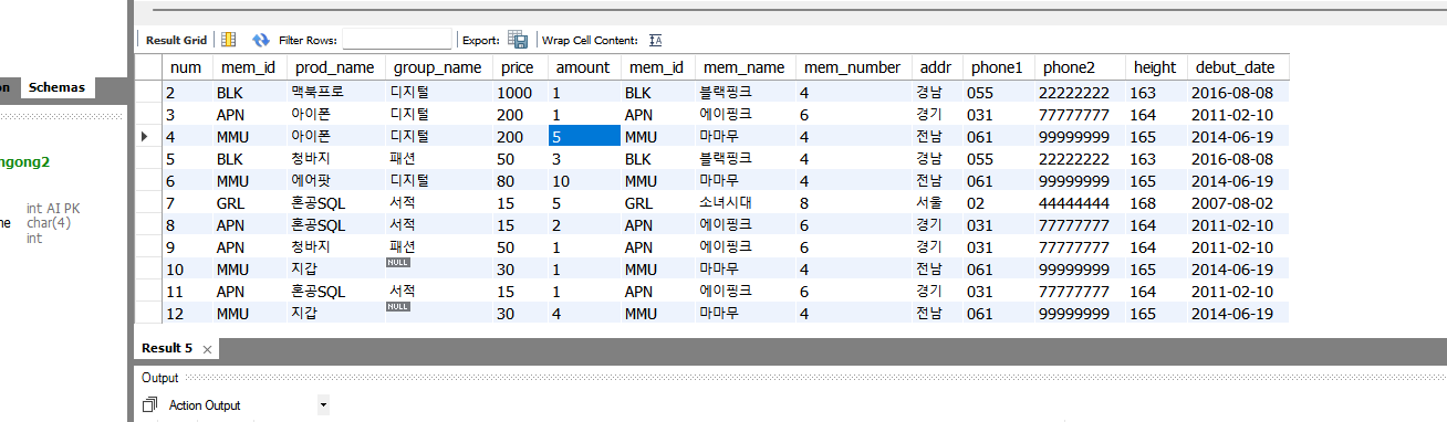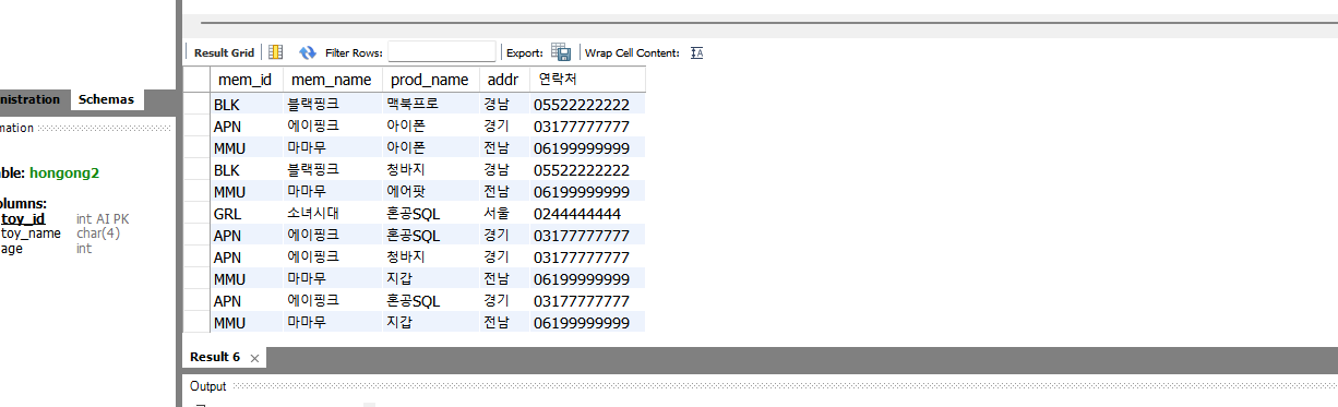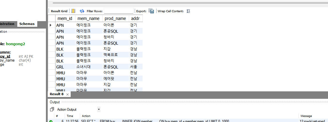 두 개의 테이블을 조인한 후에 필요한 열만 추출해보도록 하자. 이때 SELECT에 표시한 mem_id는 buy 테이블에도 있고 member 테이블에도 있기 때문에 둘 중 어떤 테이블의 것을 기준으로 할 건지 명시해줘야 한다. 안그러면 에러가 나게 된다.