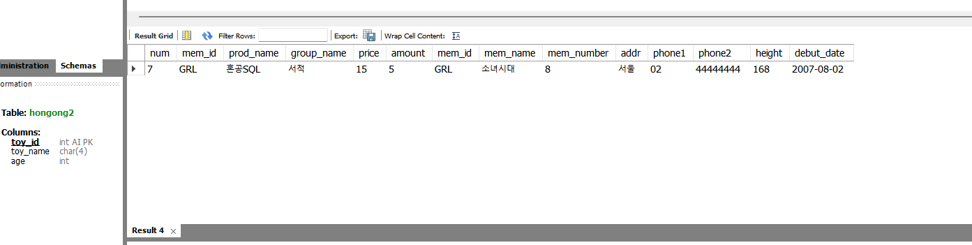 buy 테이블에서 GRL 이라는 아이디를 가진 사람의 구매 내역과 휴대전화 및 주소 정보를 join해보도록 하자.