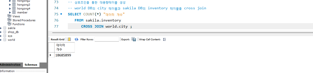 -- world DB의 city 테이블과 sakila DB의 inventory 테이블을 cross join