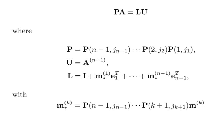 하지만 위와 같은 과정에서 만약 diangonal의 원소값이 0인 경우에는 error가 발생할 수 있다. 이러한 이유 때문에 permutation matrix를 이용하여 partial pivoting을 해줘야 한다. 이때 permutation function을 $P$라고 하면, 다음과 같이 A를 LU decomposing 할 수 있다.