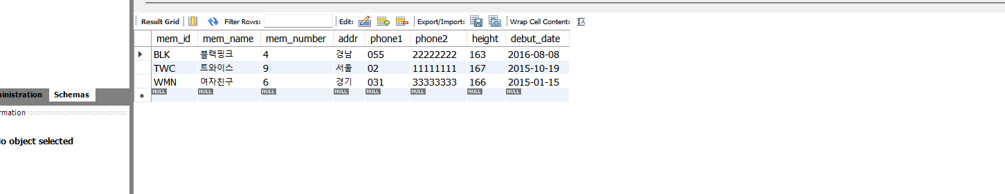 INSERT INTO member VALUES('BLK', '블랙핑크', 4, '경남', '055', '22222222', 163, '2016-8-8') ;