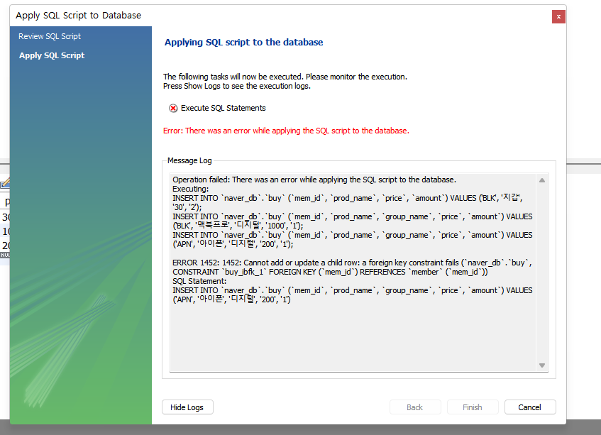 하지만 buy 테이블에 데이터를 입력하고 apply - finish 를 클릭하면 error가 발생하게 되는데 그 이유는,