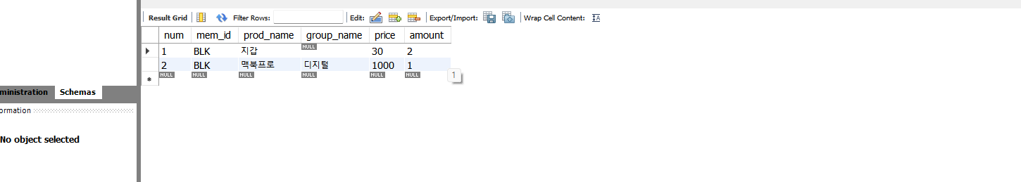 INSERT INTO buy VALUES(NULL, 'BLK', '지갑', NULL, 30, 2) ;