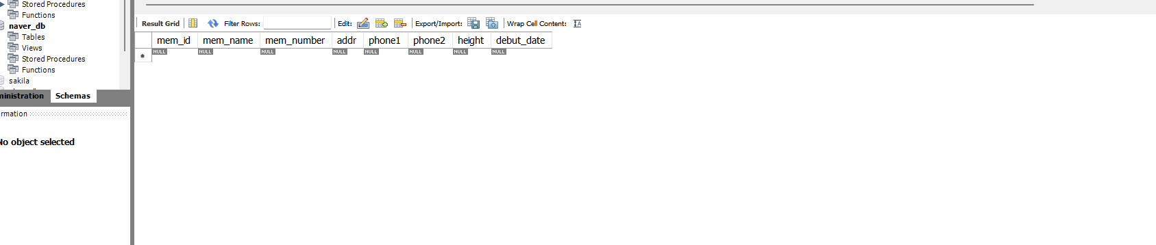 여기서 아직 PK, NN 등의 옵션을 추가해본다. 다음과 같이 빈 테이블 프레임이 만들어진 것을 확인할 수 있다.
