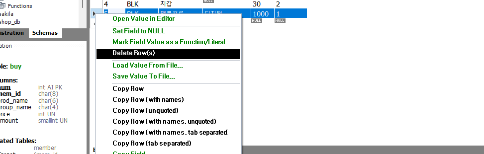 마찬가지로, 설계했던 buy 테이블도 만든 후에, member 테이블의 mem_id와 buy 테이블의 mem_id를 PK-FK 관계를 설정해주기 위해 다음과 같이 쿼리문을 수정해야 한다. GUI로는 PK-FK 관계를 선택할 수 없기 때문이다.