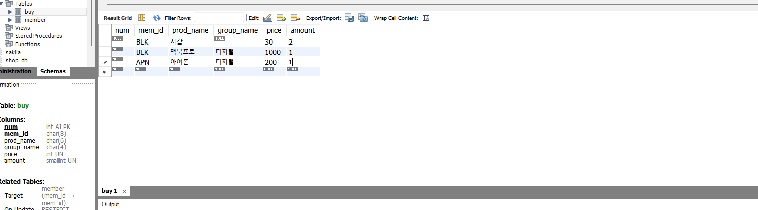 이번에는 buy 테이블을 만들어보자. 여기서 buy 테이블에서 mem_id를 FOREIGN KEY로 하여 member 테이블의 PRIMARY KEY인 mem_id와 연결하도록 한다.