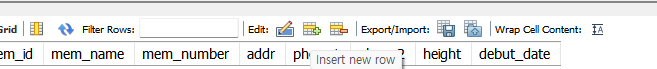 SCHEMAS 패널에서 tables의 member 테이블에 마우스 오르쪽을 클릭하여 select rows - limit 1000을 선택하면 비어져있는 테이블이 나타난다. 그리고 insert new row 아이콘을 클릭하고 다음과 같은 데이터를 입력한 후 apply-finish 버튼을 차례대로 누른다.