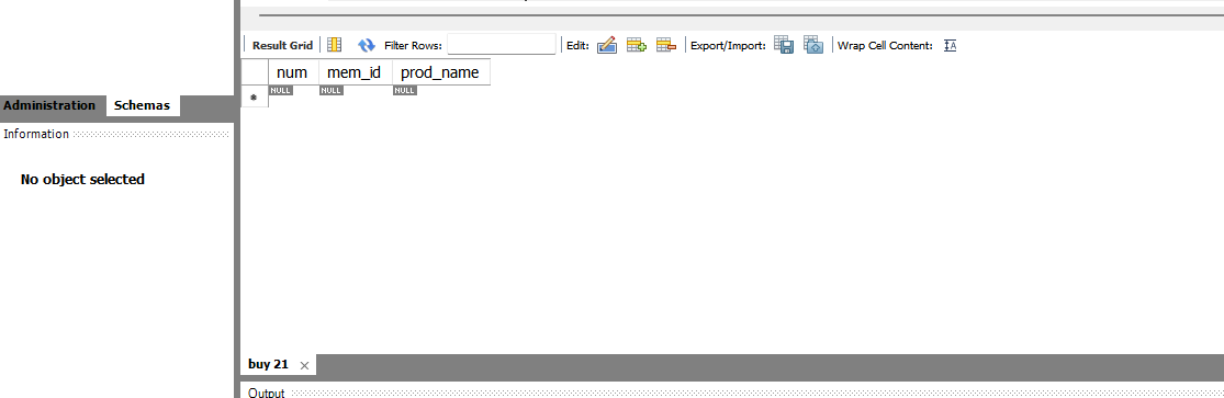 INSERT INTO buy VALUES(NULL, 'BLK', '지갑') ;