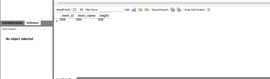 INSERT INTO member VALUES('TWC', '트와이스', 167, NULL) ;