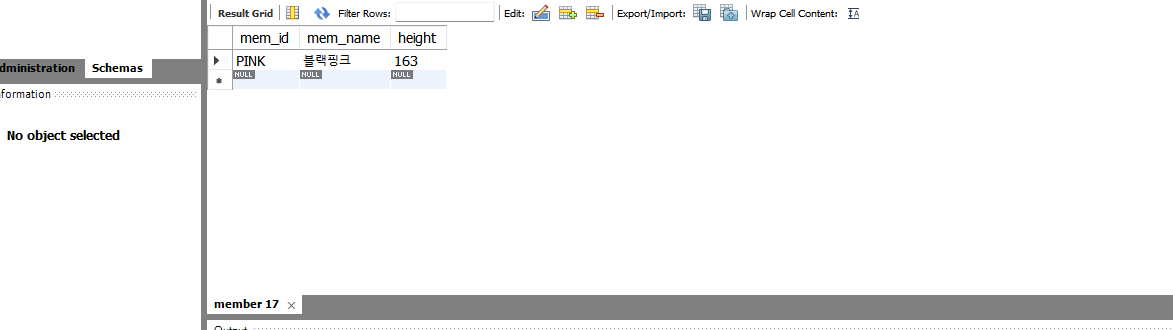 INSERT INTO member VALUES('BLK', '블랙핑크', 163, NULL) ;