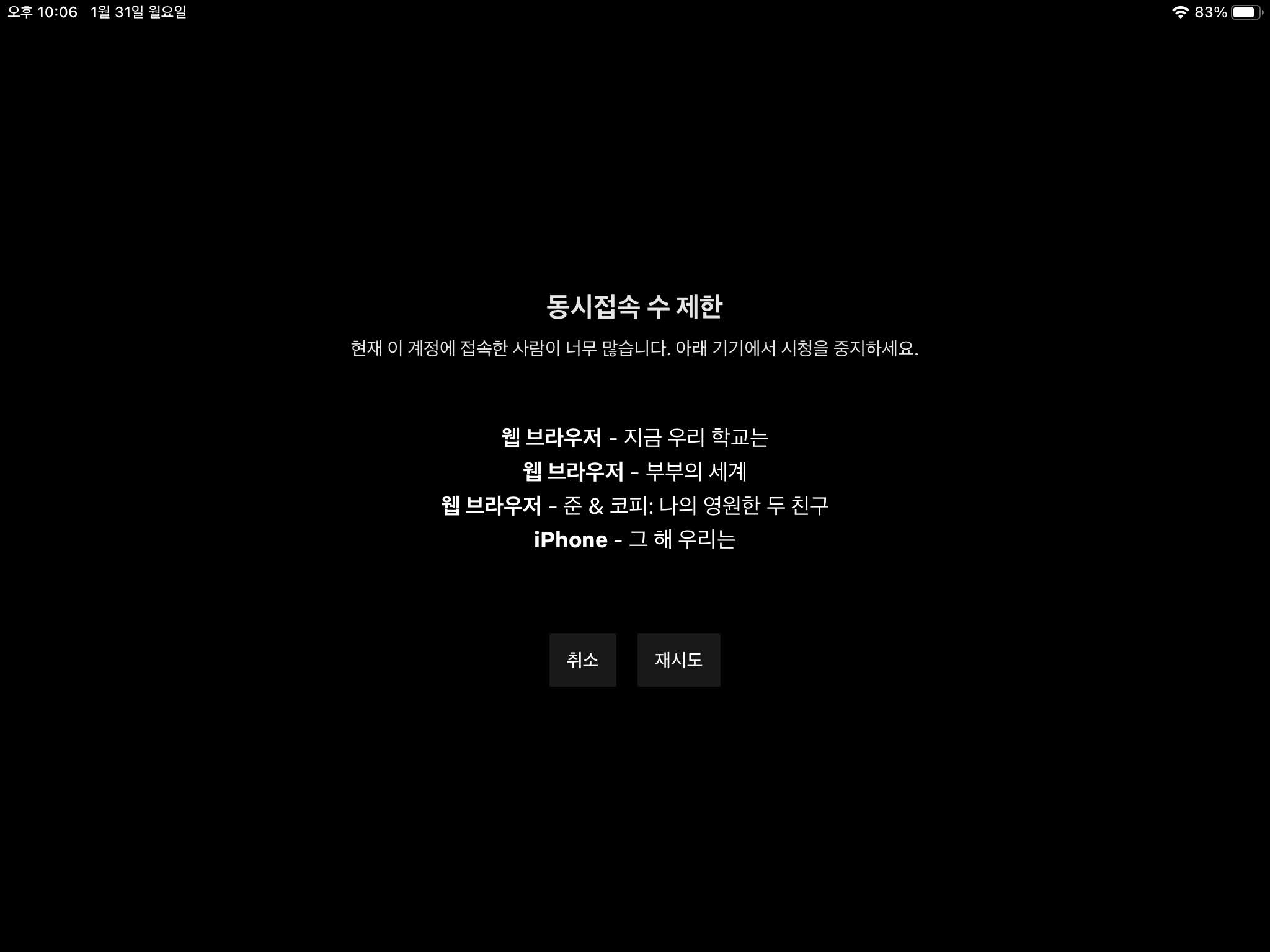 그리고 ㅋㅋㅋㅋ 친구들이랑 넷플 공유하는데 친구 한 명이 넷플 동시접속 수 제한걸렸다고 캡쳐해서 보내준 사진인데,