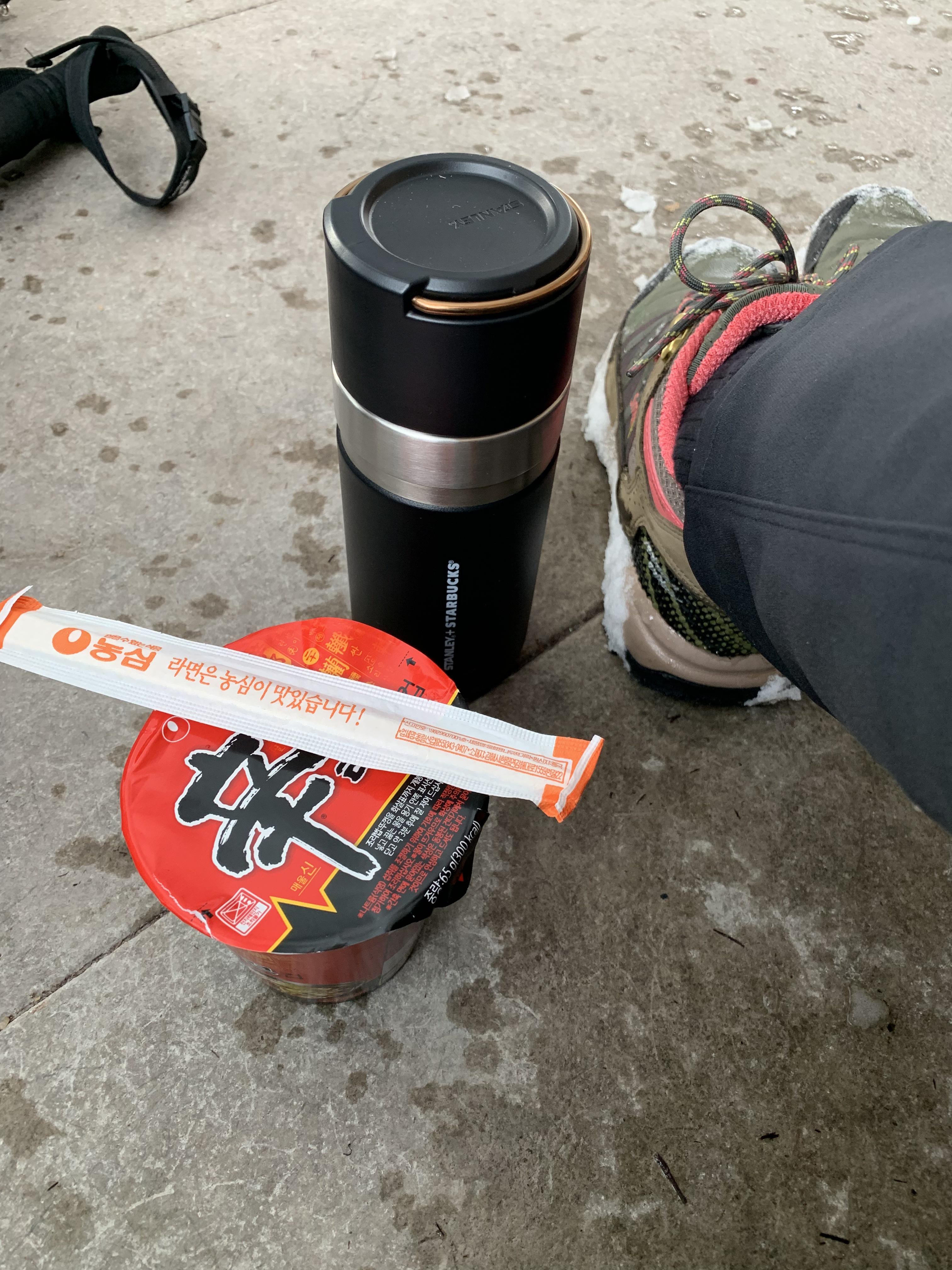 삼각봉 대피소까지 화장실이 없다고 하니 화장실을 들리고, 아이젠도 차고 맥스봉 두 개를 먹었다. 진심 꿀맛..