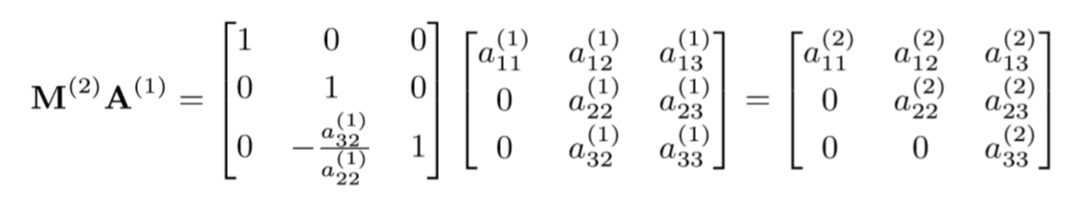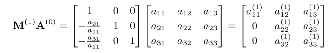 Gaussian Elimination은 각 열의 diagonal 원소 아래 모든 원소를 0으로 만드는 과정을 반복한다. 그 과정에서의 스텝은 다음과 같이 $3 \times 3$ 행렬로 보여준다.