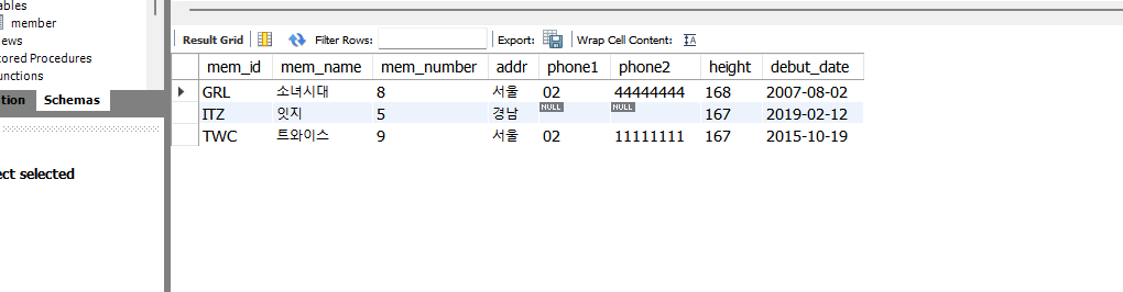 INSERT INTO v_height167 VALUES('TRA', '티아라', 6, '서울', NULL, NULL, 159, '2005-01-01') ; -- height이 167보다 작은 데이터 입력