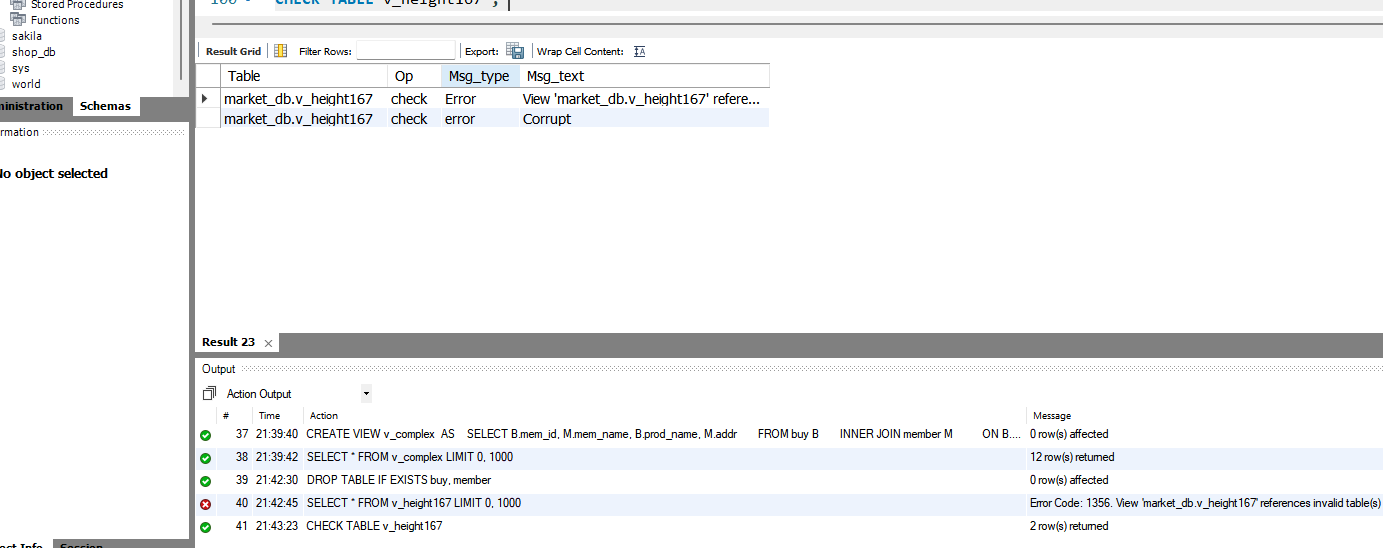 뷰가 참조하고 있는 테이블도 DROP문을 통해서 삭제가 되는 것을 볼 수 있다. 뷰가 조회되지 않는다면 CHECK TABLE을 이용하여 뷰의 상태를 확인해볼 수 있다.