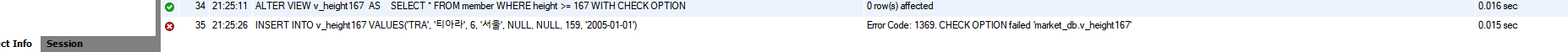 INSERT INTO v_height167 VALUES('TRA', '티아라', 6, '서울', NULL, NULL, 159, '2005-01-01') ; -- 이번에는 에러 발생