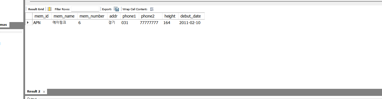 userName이라는 매개변수를 이용하여 '에이핑크' 이름을 가진 회원의 정보를 출력할 수 있다. 이번에는 입력변수가 두 개인 경우의 프로시저를 만들어보도록 하자.