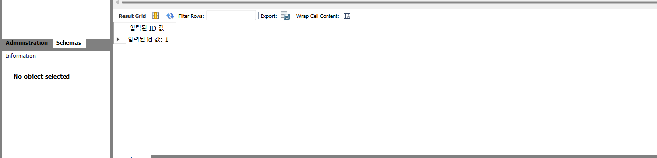 noTable을 만든 후에 user_proc3의 프로시저를 호출해본다. outValue에 변수명을 입력하여서, 해당 변수에 출력값을 할당시킨다. 즉 여기서는 max(id)의 값인 1의 값이 outValue인데, 이 값을 @myvalue라는 변수에 할당시키는 것.