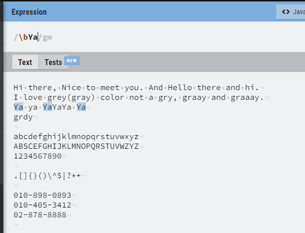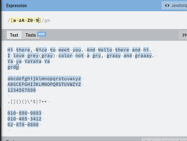 /(slash)를 이용해서 정규표현식이다- 라는 것을 표현. + 내부에는 표현식 + flag(어떤 옵션을 이용해서 검색을 할 건지)