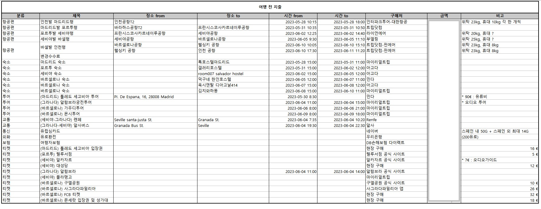 야무지게 아래 준비물도 작성해보았다! 소매치기를 가장 조심해야하기 때문에 카드도 두 개 정도 들고가고, 자물쇠, 핸드폰 스트랩 등은 챙기는 게 마음이 편할 것 같다. 그리고 스페인의 콘센트는 우리와 같은 돼지코이고 전압이 230v이지만 그냥 우리나라에서 쓰던 거 써도 문제 없다고 하여 어댑터를 따로 챙겨가지 않아도 되었다.